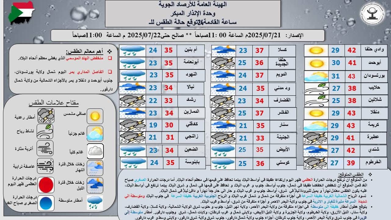 ملخص طقس الأمس: أعلى درجة حرارة: 44.5°م في بورتسودان، أدنى درجة حرارة صباح اليوم: 19.2°م في كادقلي.