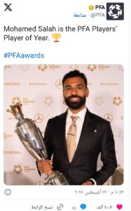 فاز النجم المصري محمد صلاح، الثلاثاء، بجائزة أفضل لاعب في الدوري الإنجليزي الممتاز (البريميرليغ) لموسم 2025/2024، المقدمة من رابطة اللاعبين المحترفين (PFA).