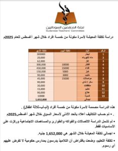 و أوضحت اللجنة في بيان اليوم الأحد، ان المكتب الاجتماعي، وجد من خلال الدراسة ان تكلفة المعيشة لأسرة مكونة من خمسة أفراد، هي ( مليون و٦٥٢ ألف  جنيه سوداني) وتعادل (٤٨٥ دولار تقريبا)  ، كما اتضح أن المرتب الأساسي للدرجة( ١٧) مدخل خدمة العامل وهو (١٢ ألف جنيه سوداني) أي ما يعادل ثلاثة دولارات ونصف تقريبا، في الشهر.