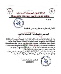 وأكد المكتب التنفيذي للاتحاد أن قرار الفصل نهائي، وتم اعتماده بعد مراجعة شاملة لما وصفه بـ”الأثر السلبي” لتصريحات الفنان على المشهد الفني والثقافي والسياسي بالبلاد.