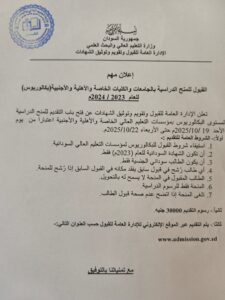 أعلنت الإدارة العامة للقبول وتقويم وتوثيق الشهادات بوزارة التعليم العالي والبحث العلمي عن فتح باب التقديم للمنح الدراسية لدرجة البكالريوس بمؤسسات التعليم العالي الخاصة والأهلية والأجنبية، وذلك خلال الفترة من الأحد 19 أكتوبر وحتى الأربعاء 22 أكتوبر 2025م.