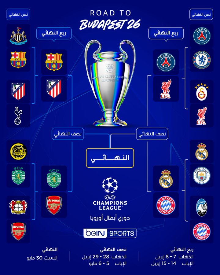 تقرير، الغد السوداني – مع إسدال الستار على دور الـ16 من دوري أبطال أوروبا، تتجه الأنظار إلى ربع نهائي يبدو، على الورق، واحداً من أكثر الأدوار إثارة في السنوات الأخيرة. ثمانية من كبار القارة حجزوا مقاعدهم، ليصنعوا لوحة تنافسية تجمع بين التاريخ، النجومية، والرغبة في المجد.